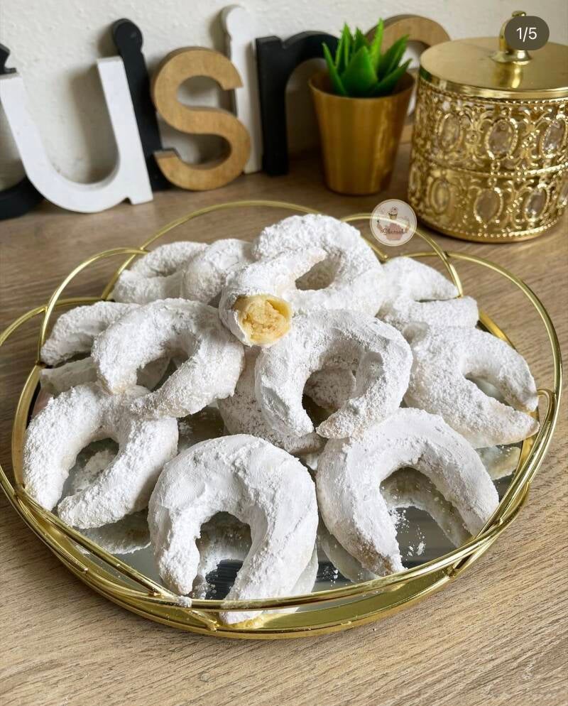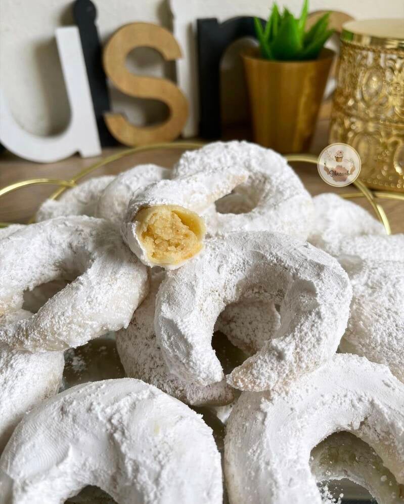 Aujourd’hui je rajoute une nouvelles spécialités qu’on prépare pour le ´Aïd. Des cornes de gazelle, très simple, facile, fondante en bouche et légèrement croustillante grâce au sucre glace autour du biscuit.