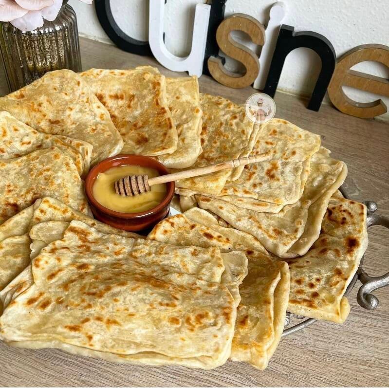 Je vous ai partagé en 2020 les msemen farcie à la viande hachée et aux légumes. Pour le goûter mercredi dernier j’ai fais des msemen nature avec du beurre et du vrai miel.