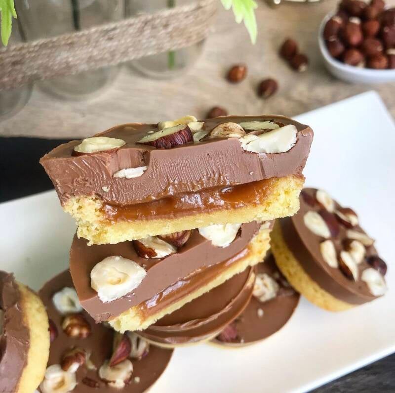 Faites fondre le chocolat au lait et versez dans les empreintes sur le caramel. Et parsemez de noisettes concassé.
