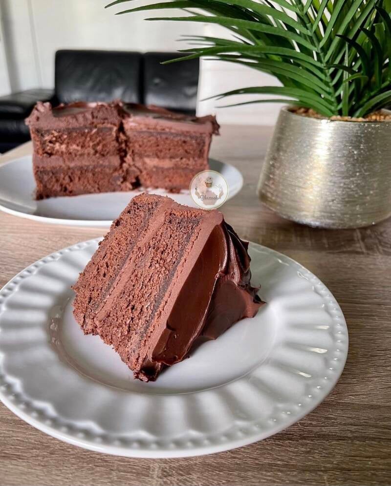 Ce devils food cake est composé d’une génoise chocolaté et d’une ganache au chocolat au lait et noir.