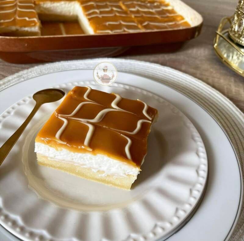 Après le gâteau qui pleure, voici le Trileçe, c’est un gâteau composé d’une génoise nature imbibée, d’une crème chantilly, nappée d’un caramel fait maison et du chocolat blanc pour la déco.
