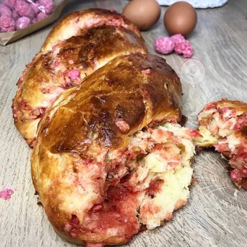 Le lendemain, j’ai posé ma brioche sur une plaque chemisée de papier cuisson. J’ai badigeonnée d’un œuf battu et mis au four préchauffé à 175 degrés pendant 20/25 minutes. À chaleur normal.