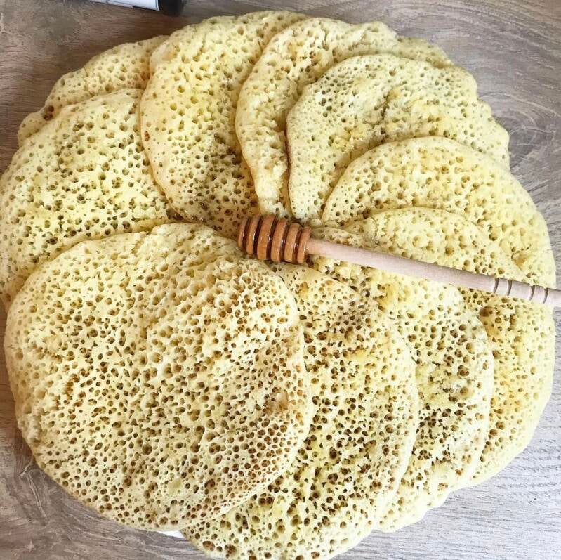 Ne pas retourner le baghrir, des trou vont apparaître. Et quand la surface, devient sec et plus humide retirée le baghrir à l’aide d’une spatule, posez sur une assiette puis badigeonnez de beurre frais.