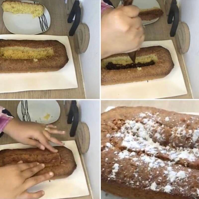 Sans casser le cake. Mettez de la pâte à tartiner au Centre puis refermez. Saupoudrez de sucre glace.